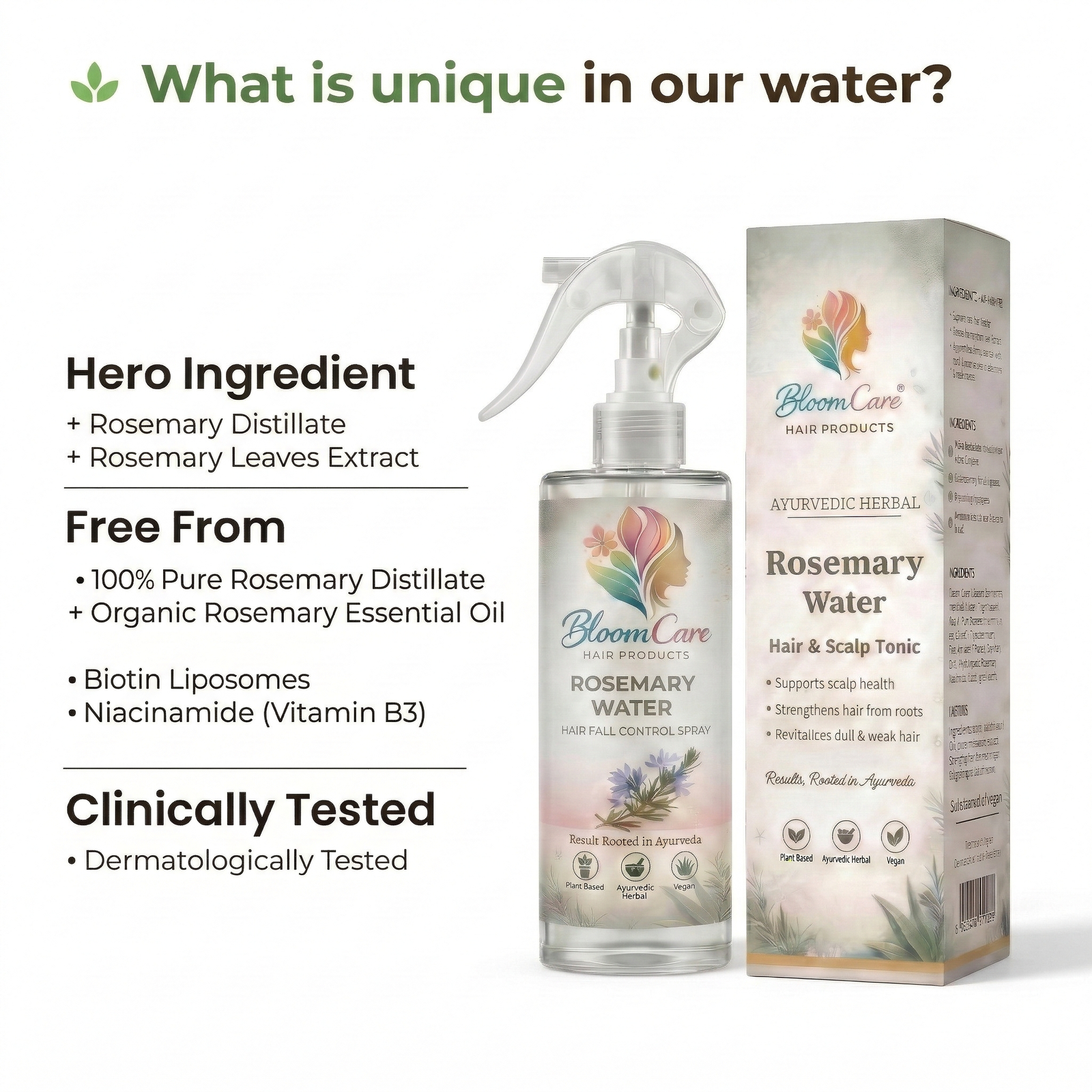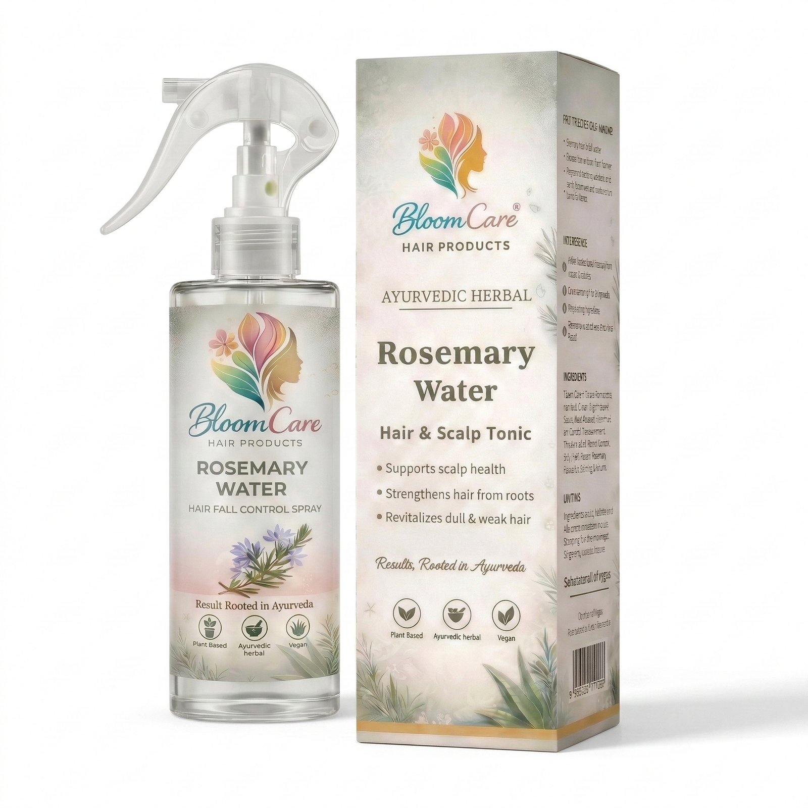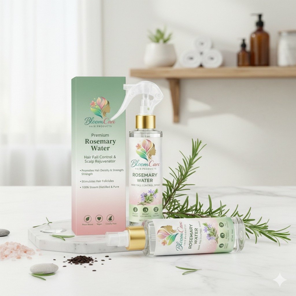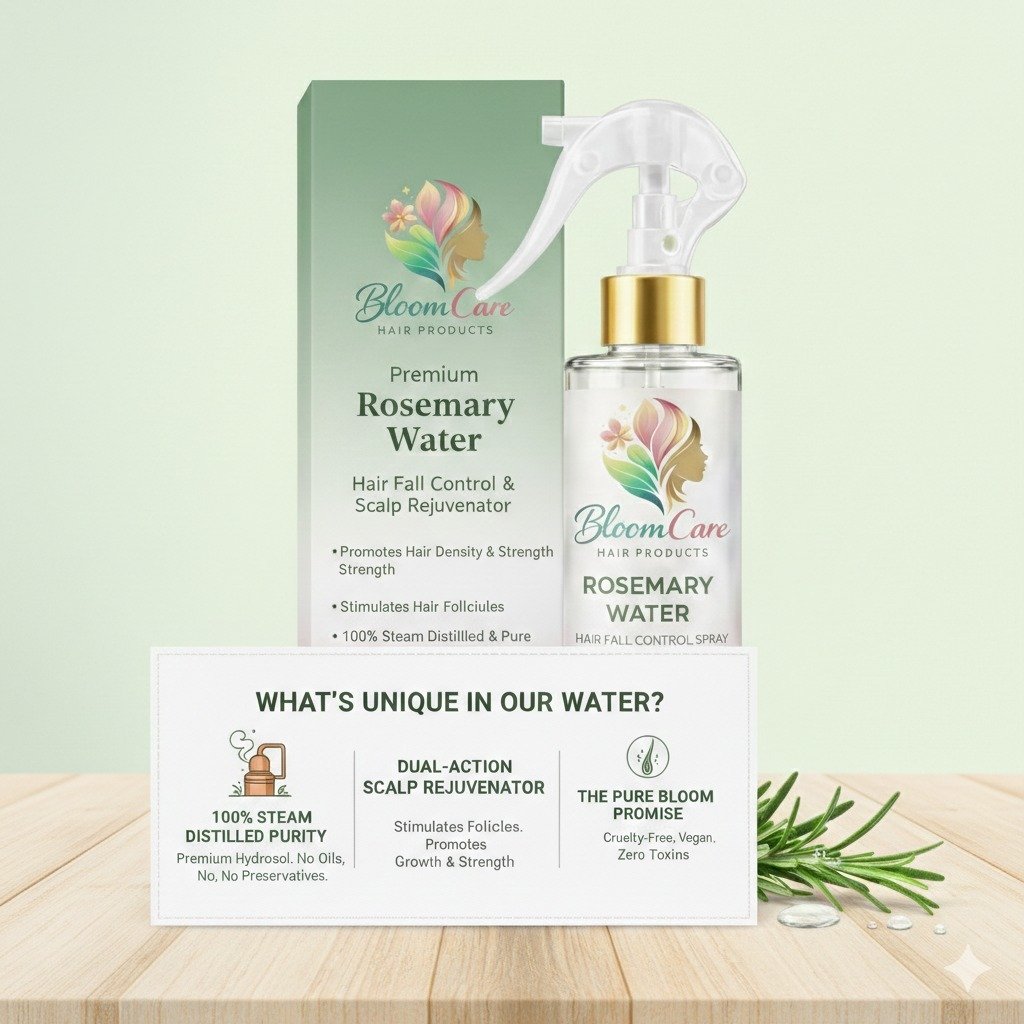 Your hair doesn’t need another product. It needs balance, nourishment, and a fresh beginning. BloomCare Rosemary Water is a premium, steam-distilled herbal tonic crafted with the pure essence of rosemary and inspired by the timeless wisdom of Ayurveda. This lightweight, water-based mist works directly at the scalp level—where healthy hair truly begins.