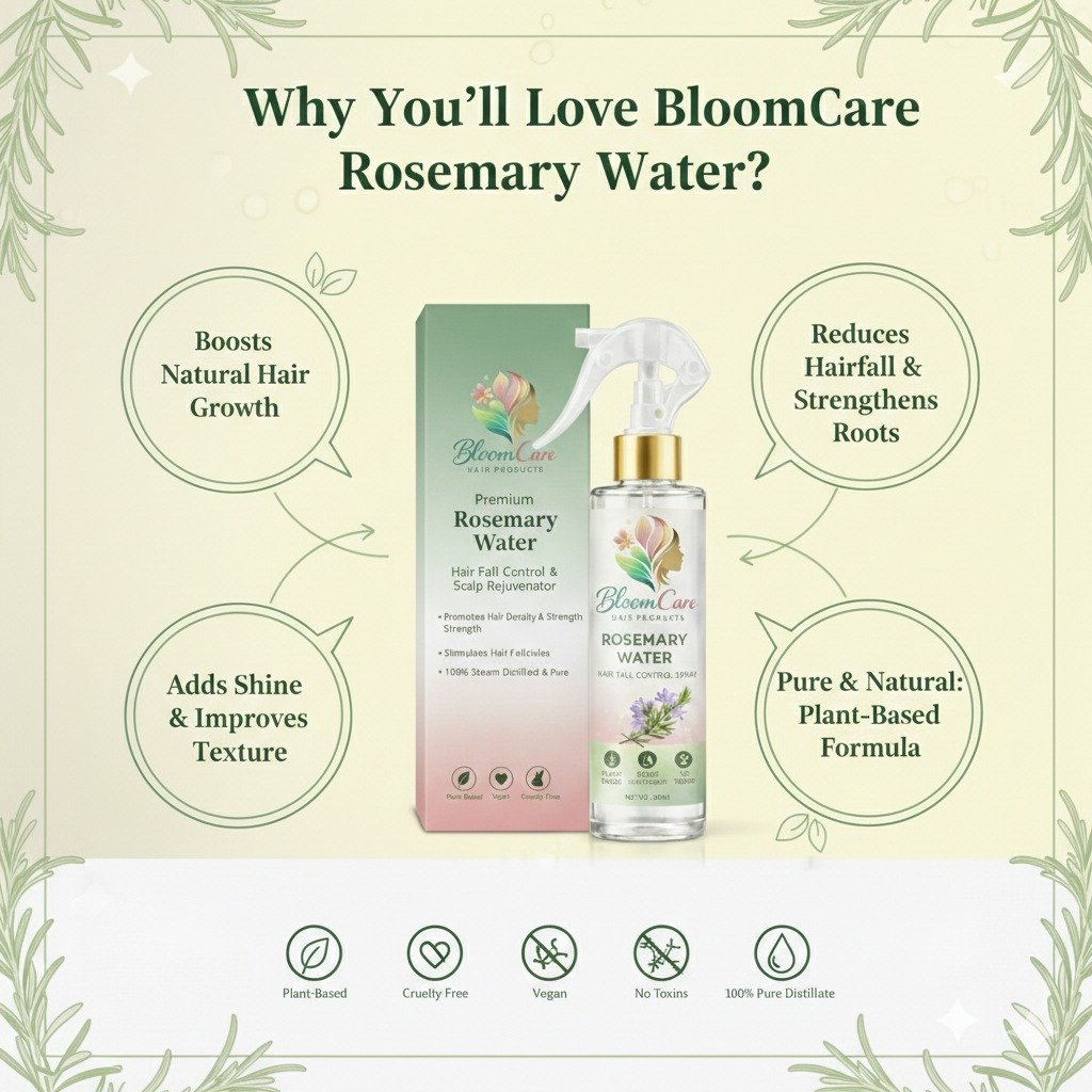Unlike heavy oils or chemical treatments, BloomCare Rosemary Water gently awakens the scalp, supports natural circulation, and helps strengthen hair from the roots upward. With regular use, hair feels healthier, looks fuller, and regains its natural vitality—without stickiness or buildup.