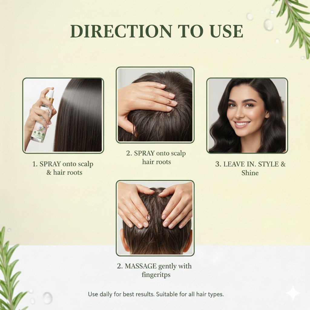 - Spray directly onto the scalp and hair roots.