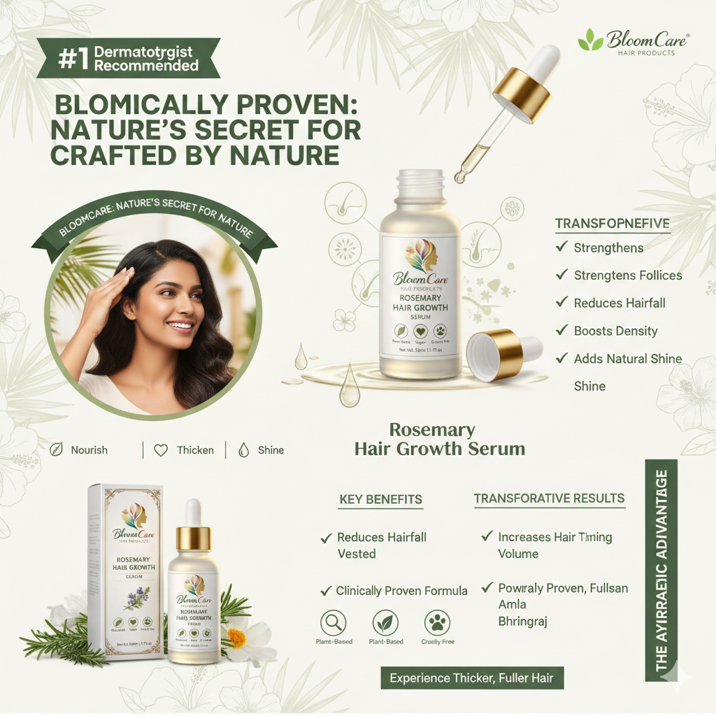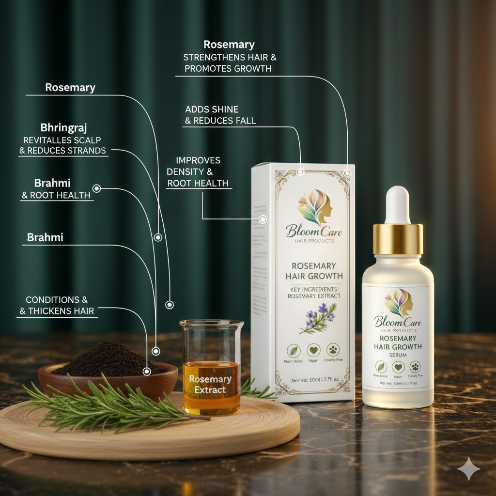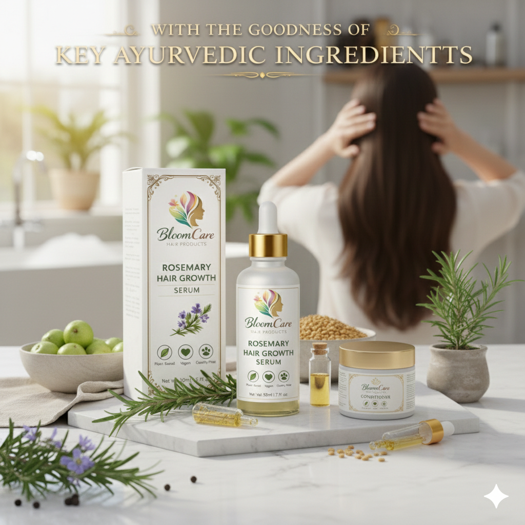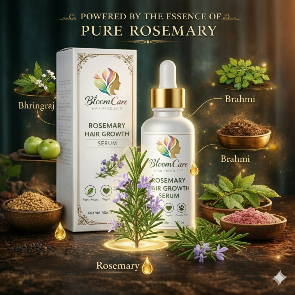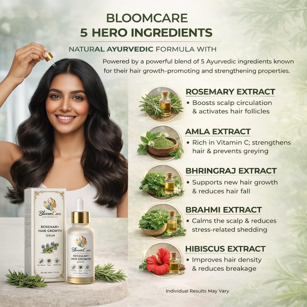 BloomCare Rosemary Hair Growth Serum is a natural, science-backed Ayurvedic formula powered by 5 hero ingredients to promote stronger, healthier hair.